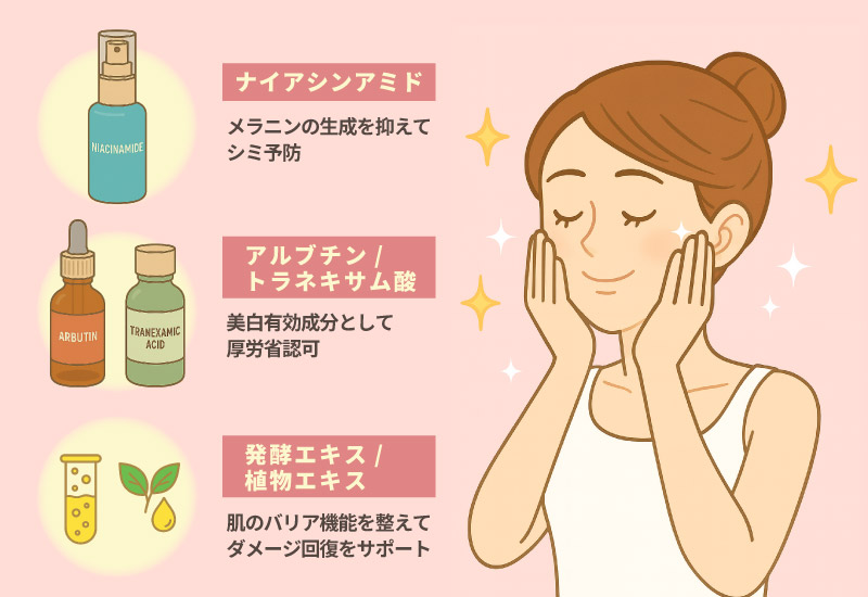 ・ビタミンC誘導体やナイアシンアミド配合の化粧水や美容液を取り入れる